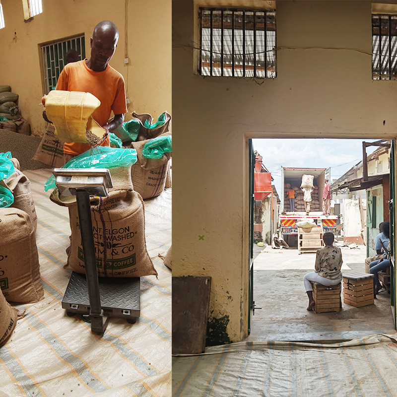 The final stage of quality control is the inspection by the Department of Coffee Development in the Ministry of Agriculture, overseeing the export process and ensuring that official standards set for export quality are respected. Samples are taken to the government laboratory and subjected to green and cup testing. If approved the “Quality Certificate” will be issued and clearance for export is given. Beans are now ready for packing into “Grain Pro” bags made from a special polythene material that protects their aroma and keeps them fresh. Then they are covered by jute bags and stitched for loading and transport.